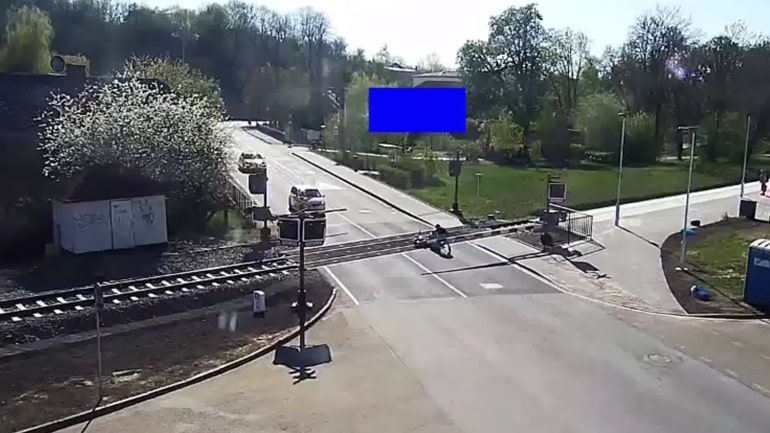 Οι μπάρες διέλευσης είχαν μόλις κατέβει αλλά ο άνδρας δεν τις είδε με αποτέλεσμα να συγκρουστεί και να πέσει πάνω στις ράγες. Στάθηκε τυχερός επειδή ένας ταξιδιώτης περίμενε στο σταθμό και έτρεξε να τον σηκώσει και να σύρει τη μηχανή από τις ράγες. Μετά από λίγα δευτερόλεπτα πέρασε και το τρένο…