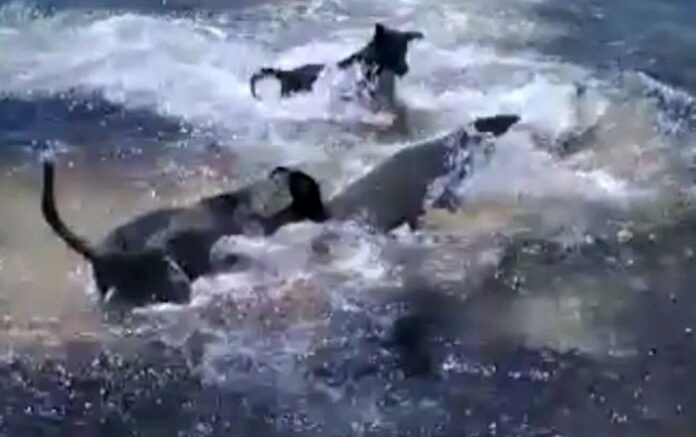 Ξαφνικά, από το πουθενά εμφανίστηκαν τέσσερα σκυλιά, τα οποία ούτε για μια στιγμή δεν φοβήθηκαν και αμέσως βούτηξαν στη θάλασσα για να κυνηγήσουν τον καρχαρία που είχε βγει κοντά στην ακτή.