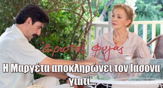 Έτσι σύμφωνα με το περιοδικό TV 24, αποφασίζει να βάλει ανθρώπους οι οποίοι δεν του επιτρέπουν την είσοδο στο σπίτι. Η Μαργέτα πλέον είναι έτοιμη να του κάνει τη ζωή δύσκολη και τον απειλεί ότι αν δεν αλλάξει μυαλά να μην ξαναπάει εκεί. Ο Ιάσονας όμως όπως θα δούμε στη σειρά «’Ερωτας Φυγάς», προσπαθεί να μπει αγνοώντας την και τότε η Μαργέτα στρέφει το όπλο της εναντίον του.