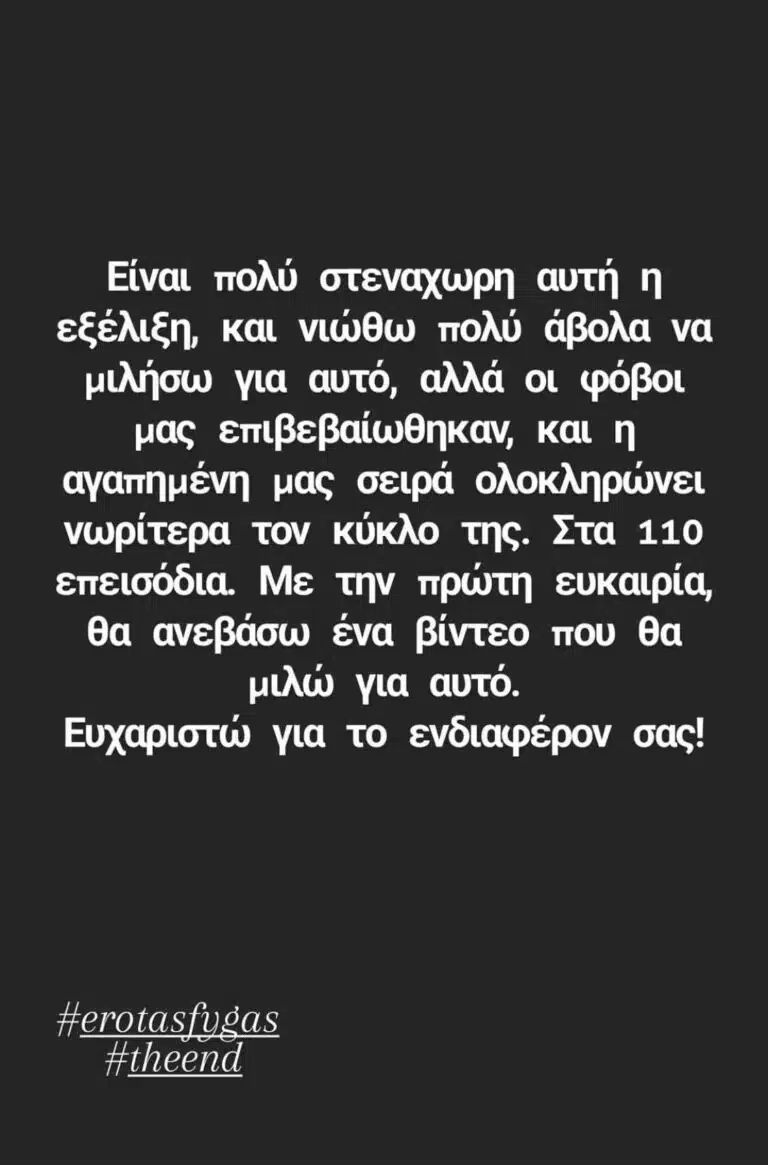 «Eίναι πολύ στενάχωρη αυτή η εξέλιξη και νιώθω πολύ άβολα να μιλήσω γι’ αυτό αλλά οι φόβοι μας επιβεβαιώθηκαν και η αγαπημένη μας σειρά, ολοκληρώνει νωρίτερα τον κύκλο της. Στα 110 επεισόδια. Με την πρώτη ευκαιρία θα ανεβάσω ένα βίντεο που θα μιλώ γι’ αυτό. Ευχαριστώ για το ενδιαφέρον σας».
