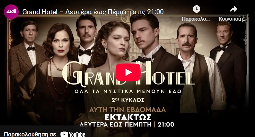 Μια ευχάριστη αλλαγή στον προγραμματισμό της σειράς. Πιο αναλυτικά, αυτή την εβδομάδα το «Grand Hotel» θα προβάλλεται από Δευτέρα έως και Πέμπτη. Έκτακτα οι τηλεθεατές θα απολαύσουν νέο επεισόδιο και την Πέμπτη, στις 21:00, μέσα από τη συχνότητα του ANT1.