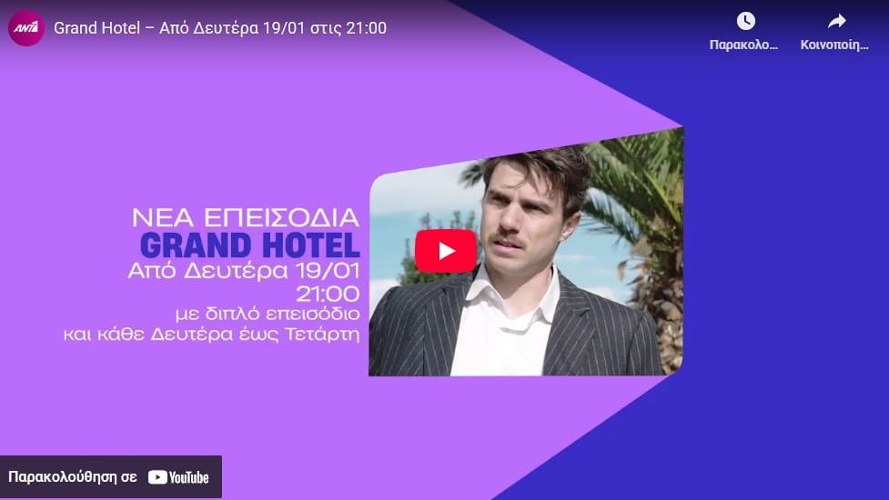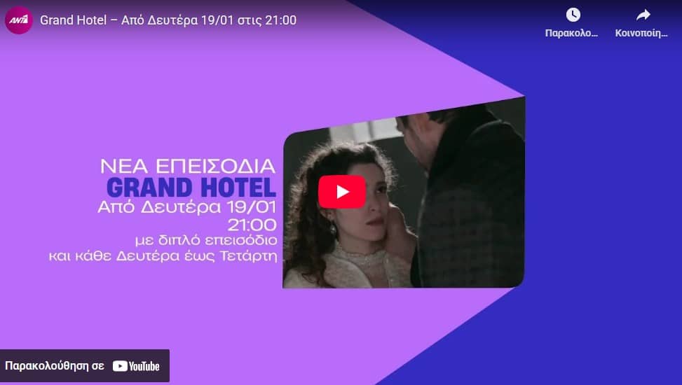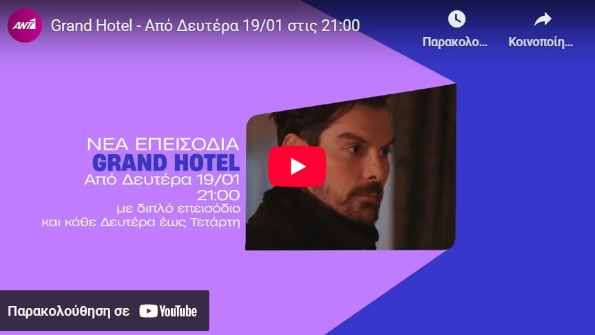 Με ολοκαίνουργια επεισόδια επιστρέφει από τις 19 Ιανουαρίου στον ΑΝΤ1 η δραματική σειρά εποχής «Grand Hotel». Αλίκη, Πέτρος, Άρης: τρεις άνθρωποι με διαφορετικές καρδιές και διαφορετικές επιλογές. Ένα ερωτικό τρίγωνο που δεν μιλά για προδοσία, αλλά για την αγάπη που δοκιμάζεται… στα άκρα.