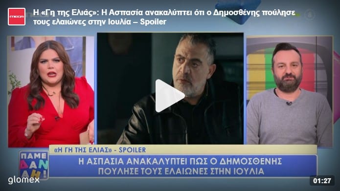 Ο Δημοσθένης μένει άναυδος με την αλλαγή που δείχνει η Ασπασία, στην γη της ελιάς. Φαίνεται πως η ψυχολόγος την έχει βοηθήσει αρκετά. Άραγε, ο Δημοσθένης και η Ιουλία θα την πατήσουν από την οργή της Ασπασίας; Θα μάθει ο Στάθης την “πλεκτάνη” που στήθηκε πίσω από την πλάτη του;