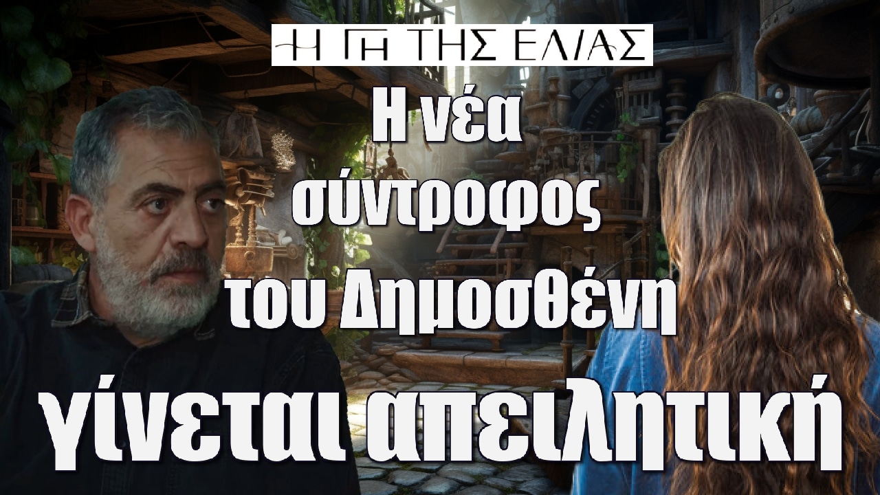 Η νεαρή σύντροφος του Δημοσθένη όμως – όπως θα δούμε στη συνέχεια – δεν αρκείται στα λεφτά που της υπόσχεται ο Δημοσθένης και αρχίζει να τον εκβιάζει, στη Γη της Ελιάς.