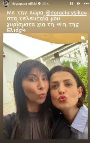Η ηθοποιός που υποδύεται την Εύα Δήμα, η Χρύσα Παππά, ανέβασε μία φωτογραφία στα Social Media, από την τελευταία της ημέρα στα γυρίσματα της σειράς “Η Γη της Ελιάς”. Στη φωτογραφία ποζάρει πλάι στη Δώρα Χρυσικού (Αρετή), δείχνοντας πως οι δυο τηλεοπτικοί “εχθροί”, έσμιξαν!