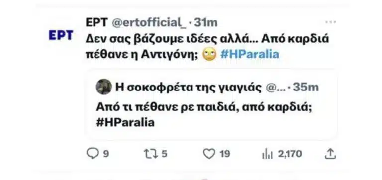 Επίσης, η ΕΡΤ, έγραψε στο Twitter, κάτι που μας έβαλε σε σκέψεις κι ενέτεινε κατά πολύ τις υπόνοιες που όλοι έχουμε για το πώς πέθανε τελικά η Αντιγόνη. Έγραψε λοιπόν στο Twitter: “Δεν σας βάζουμε ιδέες, αλλά από καρδιά πέθανε η Αντιγόνη;” Άραγε κάποιος την σκότωσε, πήρε κάτι και πέθανε; Ή κάτι άλλο; Τα επόμενα επεισόδια θα μας δώσουν ίσως τις απαντήσεις.