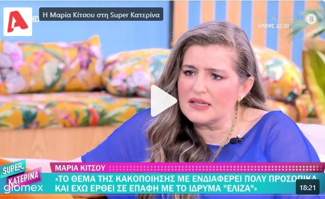 Αναφερόμενη στο ευαίσθητο θέμα που πραγματεύεται η σειρά, την κακοποίηση ενός παιδιού, τόνισε: «Με ενδιαφέρει πολύ προσωπικά αυτό το ζήτημα. Έχω έρθει σε επαφή με το Ίδρυμα Ελίζα, θέλω πολύ να βοηθήσω. Μια φορά ήμουν σε ένα σπίτι φιλικό και άκουγα από τον φωταγωγό έναν πατέρα που έβριζε, χτυπούσε την μάνα και το παιδί. Πήγα στην αστυνομία και πήγαν και τον έπιασαν. Όταν ακούσουμε κάτι πρέπει να πάρουμε την αστυνομία, το Χαμόγελο του παιδιού».
