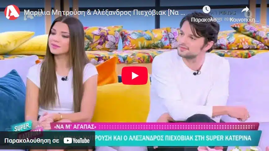 Η Μαρίλια Μητρούση και ο Αλέξανδρος Πιεχόβιακ, που υποδύονται την Εβίτα και τον Χάρη στη δημοφιλή σειρά «Να μ’ αγαπάς», βρέθηκαν καλεσμένοι στην εκπομπή «Super Κατερίνα». Οι δύο ηθοποιοί μίλησαν για τις εξελίξεις της σειράς, και τους ρόλους τους. Πως θα αντιδράσουν όταν μάθουν για τα δίδυμα;