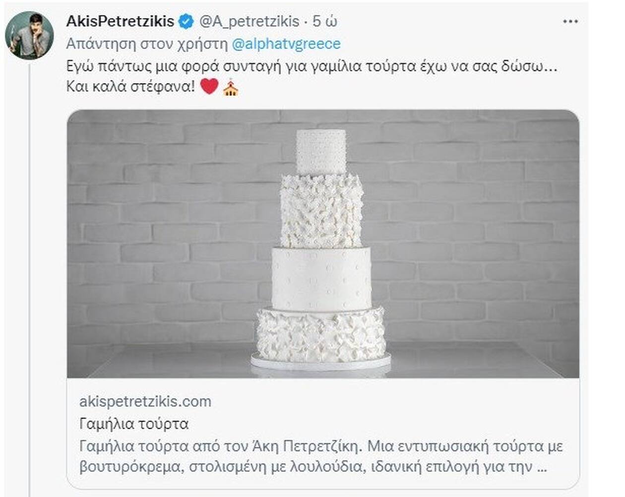 Τη σκηνή φυσικά δεν θα μπορούσε να μη σχολιάσει και ο ίδιος ο Άκης Πετρετζίκης ο οποίος ανέβασε μία φωτογραφία με μία κατάλευκη γαμήλια τούρτα και έγραψε στο tweet του: «Εγώ πάντως μια φορά συνταγή για γαμήλια τούρτα έχω να σας δώσω… Και καλά στέφανα!».