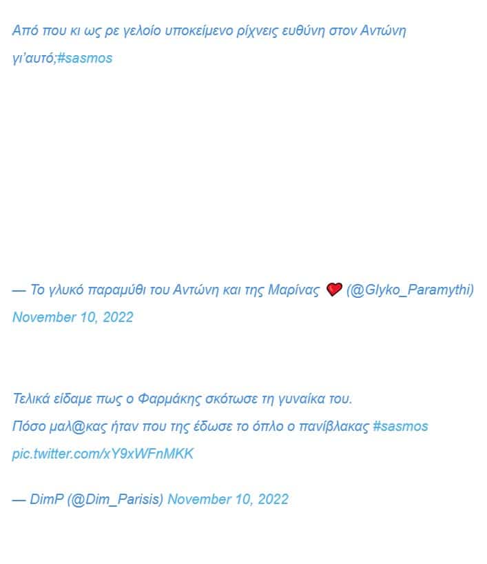 Οι χρήστες του Twitter, όπως θα διαβάσετε και στα παραπάνω σχόλια έδειξαν για ακόμα μια φορά την αγάπη τους στον Αντώνη Φραγκιαδάκη, ο οποίος τελικά δεν ήταν αυτός που τράβηξε την σκανδάλη σκοτώνοντας την γυναίκα του Ευθύμη Φαρμάκη στην σειρά, Σασμός.