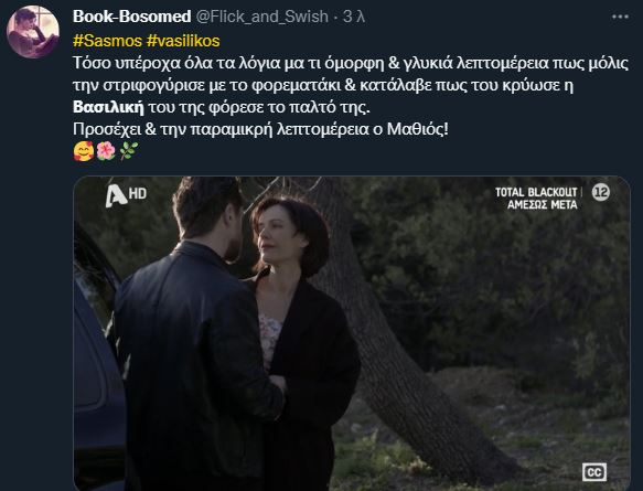 Στο επεισόδιο που προβλήθηκε το βράδυ της Πέμπτης, ο Μαθιός πήρε ένα δώρο στη Βασιλική. Της πήρε ένα υπέροχο φόρεμα και εκείνη επιτέλους πέταξε τα μαύρα.