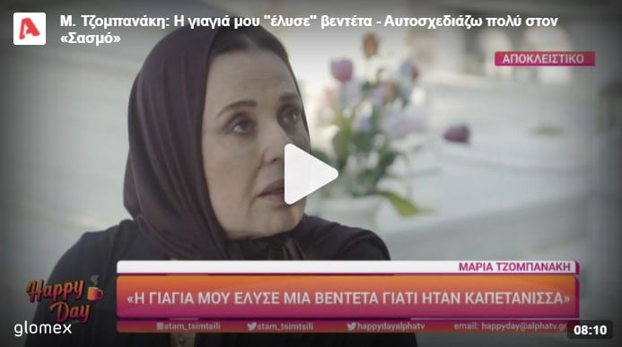 Μια άκρως αποκαλυπτική αλλά και ενδιαφέρουσα συνέντευξη παραχώρησε η Καλλιόπη της τηλεοπτικής σειράς Σασμός στην Σταματίνα Τσιμτσιλή και το Happy Day. Η καπετάνισσα, όπως την αποκαλούν όλοι στο σίριαλ υποδέχθηκε στο αρχοντικό της την παρουσιάστρια και μίλησαν για τον ρόλο της στην πετυχημένη σειρά. Τι αποκάλυψε η Μαρία Τζομπανάκη για την Καλλιόπη και πως αντέδρασε μόλις είδε τον εαυτό της μετά από χρόνια στο γυαλί;