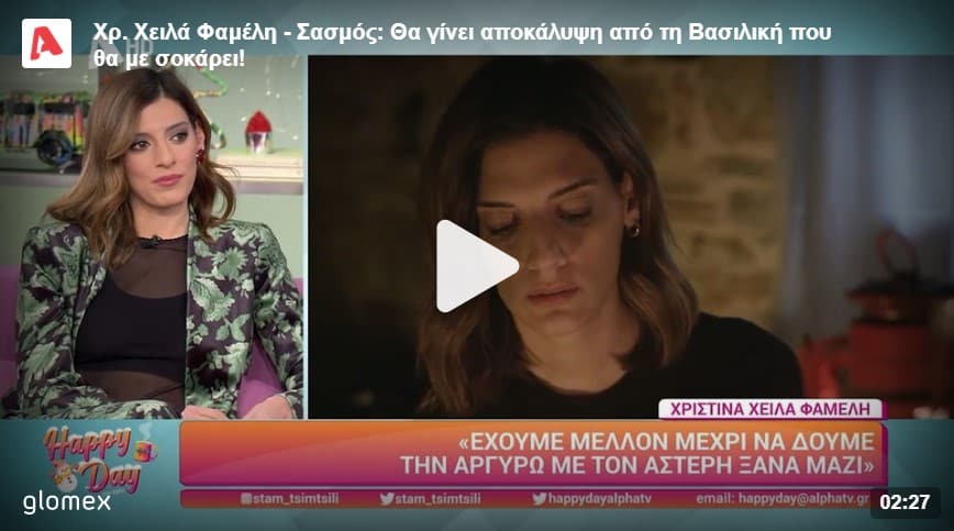 Η Χριστίνα Χειλά Φαμέλη, καλεσμένη στην εκπομπή Happy Day, μίλησε για τη σειρά Σασμός, αποκαλύπτοντας πως έρχεται μία αλήθεια για την Αργυρώ, που θα την σοκάρει..