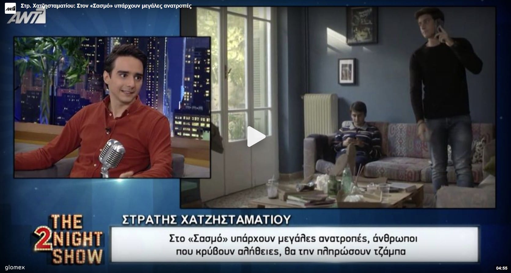 Ο Γρηγόρης Αρναούτογλου υποδέχεται στο «The 2Night Show» τον Στρατή Χατζησταματίου, τον Μανωλάκη από τη σειρά «Σασμός». Ο ταλαντούχος ηθοποιός, αποκαλύπτει ότι θα γίνουν ανατροπές και θα αποκαλυφθούν μεγάλες αλήθειες στη σειρά.