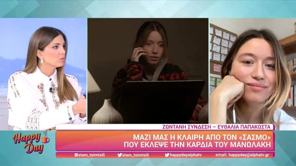 Η Ευθαλία Παπακώστα, η «Κλαίρη» που έχει κλέψει την καρδιά του «Μανώλη» στην επιτυχημένη σειρά του Alpha, Σασμός, φιλοξενήθηκε το πρωί της Τετάρτης 2/3 στο Happy Day. Μεταξύ άλλων, η νεαρή ηθοποιός αποκάλυψε ότι δούλεψε με την Παραολυμπιονίκη Καρολίνα Πελενδρίτου προκειμένου να αποδώσει σωστά τον ρόλο.