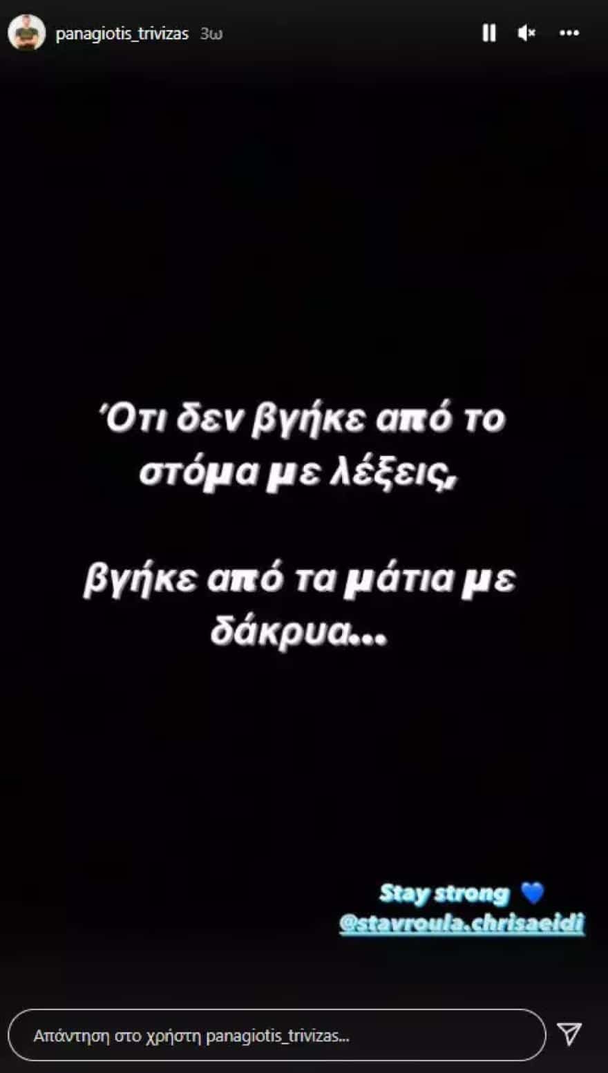 Μάλιστα, ο αγαπημένος της σύντροφος, Παναγιώτης Τριβυζάς παρακολουθώντας το τρέιλερ με τα δάκρυα της αγαπημένης του, έστειλε το δικό του μήνυμα υποστήριξης, κάνοντας μια ανάρτηση μέσα από τον προσωπικό του λογαριασμό στο instagram όπου ανέφερε χαρακτηριστικά: «Ό,τι δε βγήκε από το στόμα με λέξεις, βγήκε από τα μάτια με δάκρυα. Μείνε δυνατή»