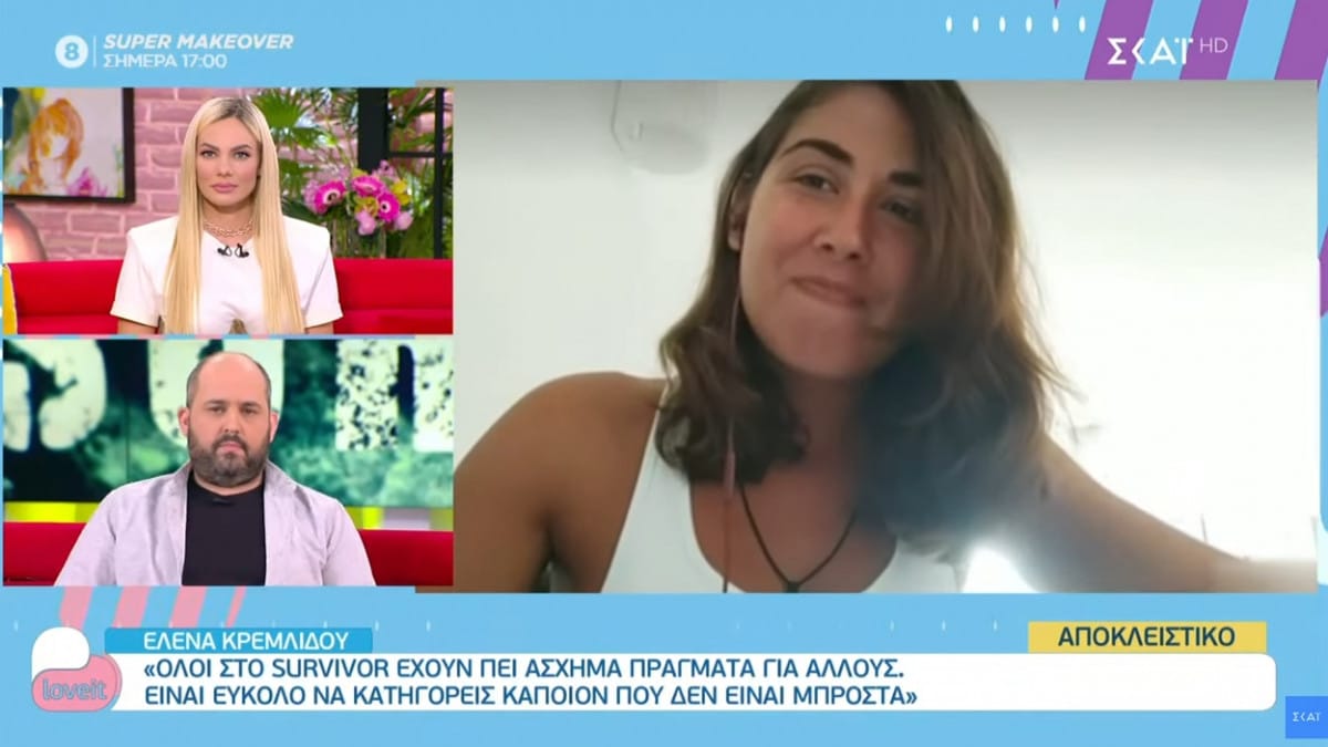Η Ελευθερία δεν φλερτάρει τον Αλέξη, έτσι κάνει με όλους. Κατηγορώ τον Αλέξη και όλα τα αγόρια που συμφώνησαν όταν είπε ότι η Ελευθερία φλερτάρει με όλους. Δεν είπα ποτέ τον Νίκο χωριάτη. Σοκαρίστηκα με το μένος του να πει κάτι για μένα. Μου κακοφάνηκε που η Μαριαλένα έκανε παρέα με την Άννα Μαρία» είπε, μεταξύ άλλων, η Έλενα Κρεμλίδου.