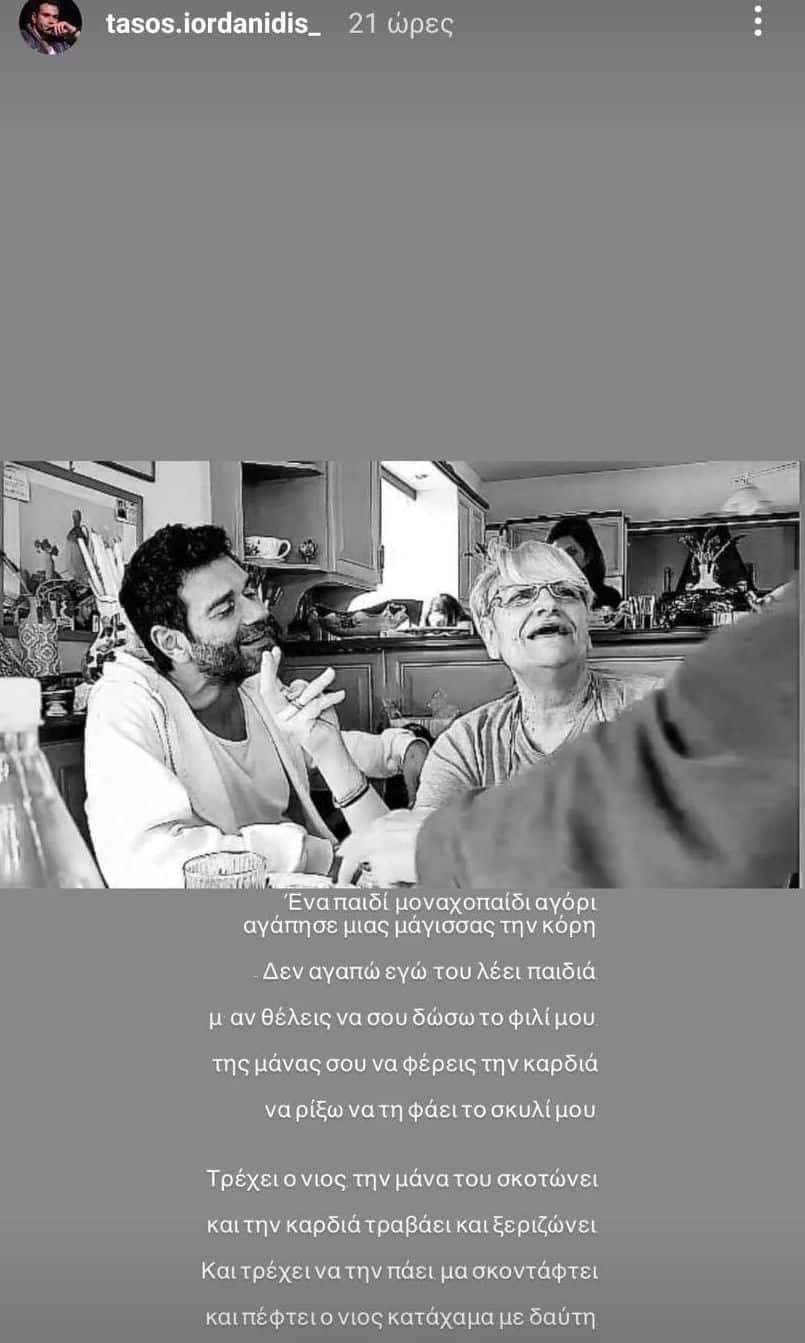 Ο Τάσος Ιορδανίδης, που την περίοδο αυτή τον απολαμβάνουμε στην τηλεοπτική σειρά του Mega « Η Γη της Ελιάς», δημοσίευσε πριν μερικές ημέρες δύο στιγμιότυπα με την αγαπημένη του μητέρα.