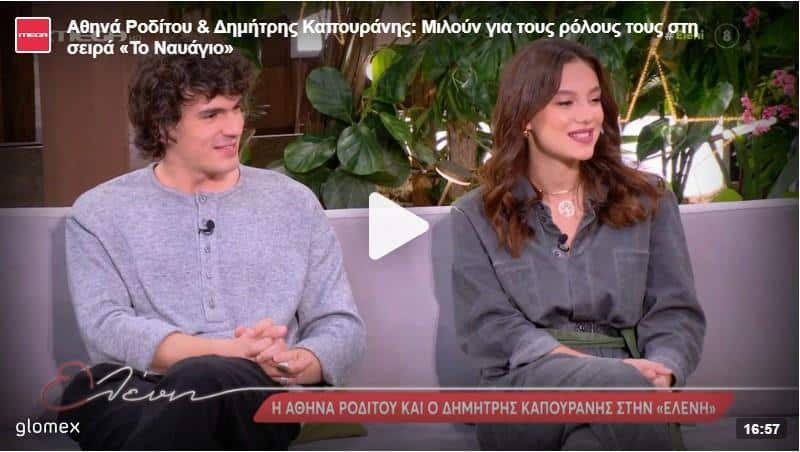 Στην εκπομπή, Ελένη, βρέθηκε η Αθηνά Ροδίτου και ο Δημήτρης Καπουράνης και μίλησαν για το πως ασχολήθηκαν με την υποκριτική, τη δυσκολία που έχει ο χώρος αλλά και ο ρόλος τους στο Ναυάγιο.