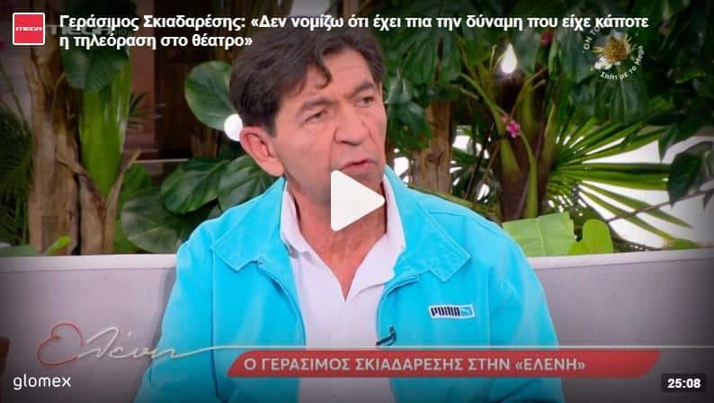 Ο Γεράσιμος Σκιαδαρέσης ήταν καλεσμένος στην Ελένη και μίλησε για την θεατρική παράσταση στην οποία πρωταγωνιστεί, τον ρόλο του στο Ναυάγιο και ανέφερε πώς επιλέγει τους ρόλους του.